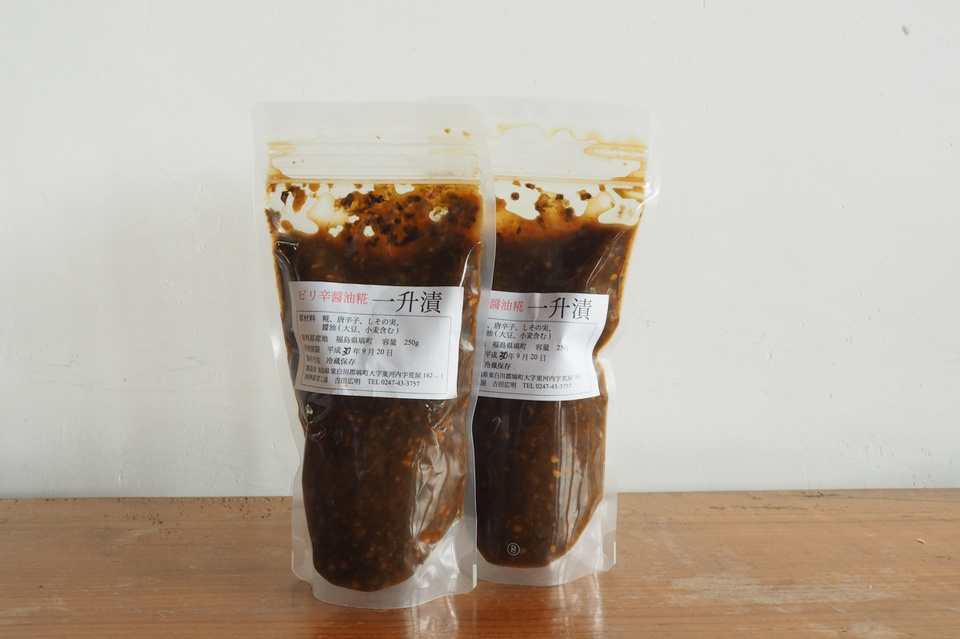 しその実、麹、しょう油、唐辛子を全部一升ずつ漬けることからこの名前が付いた、東北の名産です。ピリッとした辛さが食欲をそそります。ごはんにかけて食べても美味しく召し上がっていただけます。豆腐・納豆などにかけてみてください。クセになる味です。